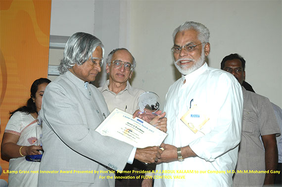 The Lemelson Foundation, USA and IIT Madras jointly selected our invention “ Flow Control Valve in Grass root category and presented L-Ramp Award by the Honorable former President of India A.P.J. Abdul Kalam to Our Company Managing Director Mr. Mohamed Gany in the year 2007.