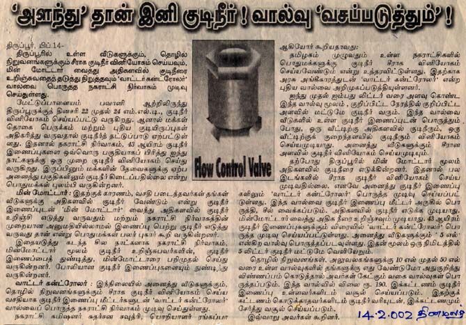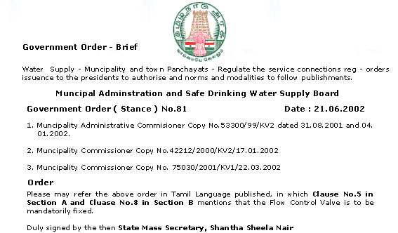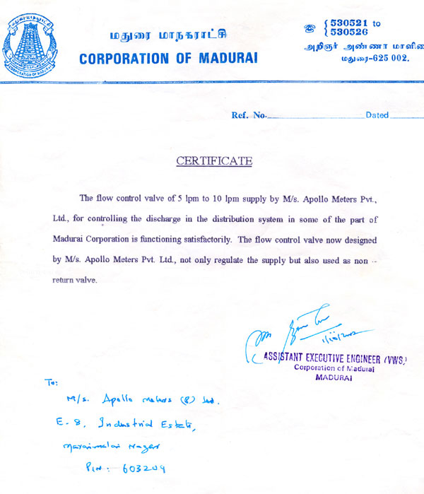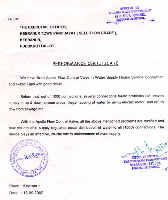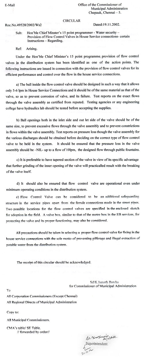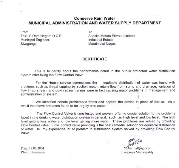 The Flow Control Valve eradicates the above problems and allows only the designed flow rater irrespective of varying pressures of down stream and upstream areas. At the time of illegal tapping by suction motors, it does not allow any excess water than the stipulated flow rate. Further, prevents return flow from sump, pit tap and sewages thereby the entire distribution system is protected and equal proportional leaving the system free from enormous maintenance.